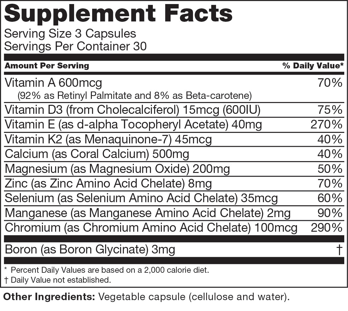 Souvent négligés dans d'autres formules de calcium, CalciuMK+ contient du bore, du magnésium, du manganèse et du zinc, ainsi que du sélénium, de la vitamine D3 et de la vitamine K2, tous essentiels au maintien d'une bonne santé osseuse et à une bonne absorption du calcium.